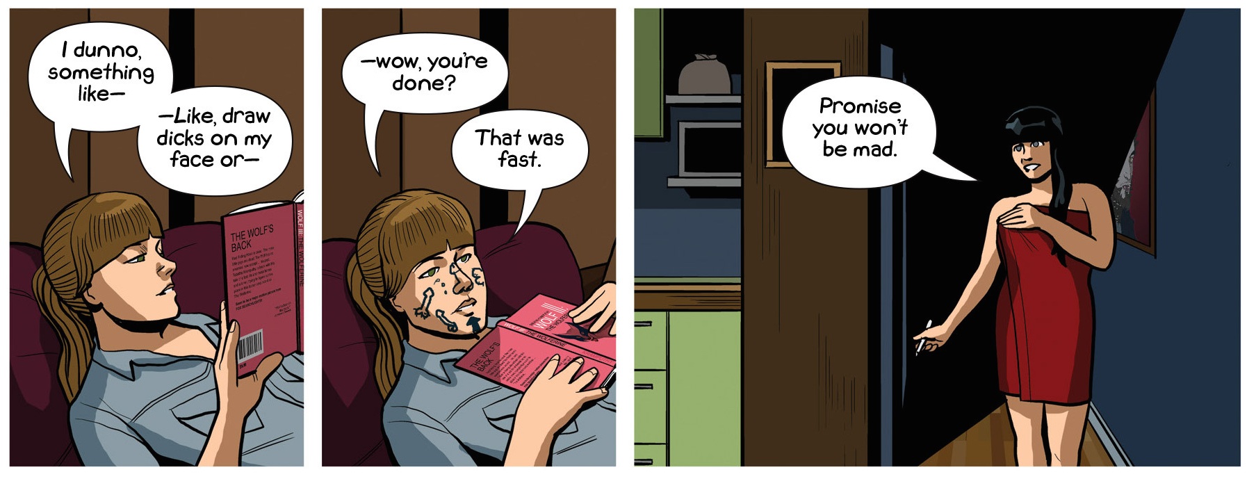 This may not be the case for everyone because as a comic book, this sits far away from the classic superhero tomes. There aren’t really any good guys or bad guys, even the “villains” are completely ordinary people. There is no fantastical escapism and the art will not make you sit in awe of human anatomy or surgical cosmetics. The letters pages are the same as the comic, because the fans of the book have written their porn in the woods stories, which could have easily featured in the comic itself. What Matt and Chip have done is provided a format for readers to reveal their sexual secrets and not feel ostracised for them. There are some incredible tales out there and the deliberate facetiousness of the responses serves to normalise the whole conversation. It is fine to talk about sex and it is not depraved to “rub one out” to a picture of Pamela Anderson. I do wonder whether both creators realised how much of an impact they would have because there are some remarkably honest and sad stories in the back. This all stemmed from Fraction & Zdarsky’s ability to portray the teenage sexual experiences of boys and girls. From this we, as readers, were able to empathise with Suzie and Jon because we recognised exactly what they were going through. But then it became all too real.