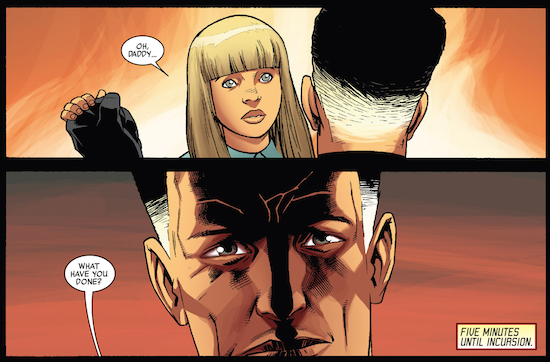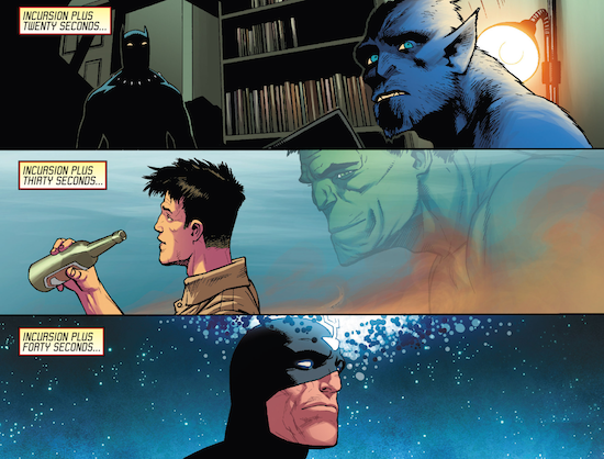 Which leads to the most pertinent question of all, in those eight hours to incursion, why did no member think to observe the universe’s most dangerous man. In fact I also completely forgot about Namor until the incursion came and went, because I was caught up in the emotional diatribe that was so overwhelmingly well depicted. Despite me thinking that the most intellectual minds in the universe would never give up, especially not Reed, I thoroughly enjoyed Kev Walker’s portrayal of failed heroes. It was quite twee seeing Bruce saying farewell to Hulk, as it was Reed visiting Valeria in Latveria. I am sure she would have had some ideas of what to do, but her statement to her father was quite apt. Beast asking his younger self’s opinion leads to quite appropriate fury and condemnation. Walker’s ability to convey emotion is utilised effectively as we see T’Challa’s regret, Strange’s sorrow, Bolt’s fury and most aptly McCoy’s anger. Stark’s response is quite intriguing because he reflects on his drinking habits and actually contemplates taking his own life when the time comes. These pages of superb character work and artistic expression completely overawe our thoughts, as it does the Illuminati, of the real threat.