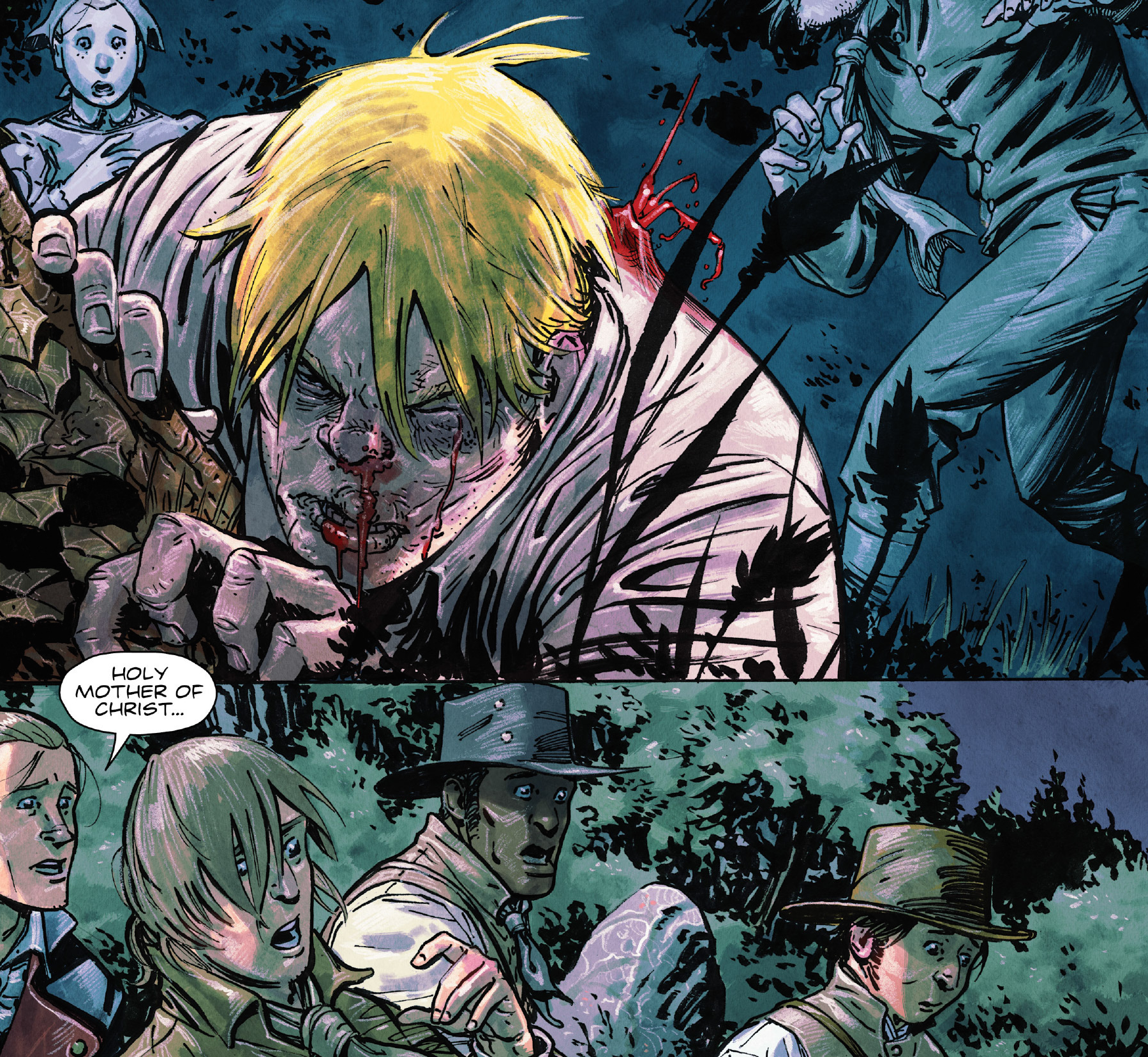 The book is in a world in and of itself because it combines a couple of genres to produce a comic like no other. The title itself is a reference to American Romanticism and extending an area of freedom. The idea of pushing your boundaries and putting forward the ideas of your country is the basic premise. That notion is combined with a sense of adventure and discovery of creatures that threaten their very existence. This is where the creators have a chance to shine. It is worth mentioning from the outset that Roberts has a refined attention to detail and had placed a lot of emphasis on exaggerated expressions and thoroughly researched into weapons and the garb of that era. Gieni has a rich and lush colour palette, focusing on the deeper and more saturated shades, giving the book immense character.