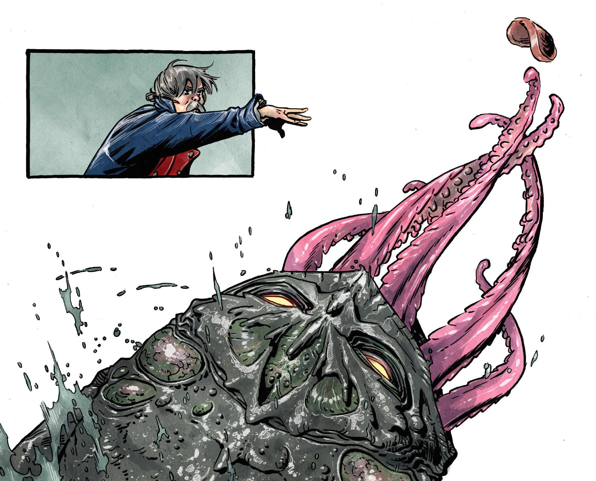 The expressions alluded to above are key to the comic and instantly portray the story through the art alone. The focus on the above panel of Irene’s lips clearly tells the happenings of the previous issue. Her sorrow and guilt is rife through her sullen eyes and tearful gaze. The switch to the Captains anger is deliberate and appropriate, as he grits his teeth and focuses his stare at Hardy. The creases around his cheek bones are accentuated by the shades of pink of his face. It is incredibly expressive. Combining these artistic merits gives a comic that relies on known stereotypes to portray a type of character. We know from Clark’s normal demeanour that he is a tough and stoic character, where Charbonneau is a layabout ruffian. The plot then develops and we are able to see how they respond, and for the most it is as expected. Especially when it comes to reacting to the sheer terror of the monsters they encounter.