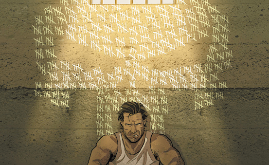 Forget about three dimensional covers with huge red borders, this weeks best front page was courtesy of Mitch Gerads. I have always been impressed by his quite raw style and outlook on Punisher. His pencils are clean and his characters are quite realistic, even Frank’s face looks weathered and battered. He even does his own colours which allows full control over the tone and theme of the book, this was never better demonstrated that the arc involving Electro. This cover has warmth in a time of incarceration because the yellow tint and shining sun peer through the cell bars. It casts light over a broken Punisher who sits angrily wielding a fresh knife, for all to beware. Especially when you see the figure seriously injured to the right. The tally symbols are arranged into the Punisher symbol which not only demonstrates the length of incarceration but also it serves as a warning sign to onlookers. The scowl and aggressive gaze whilst sitting with arms over knees is a particularly threatening image. Though the rays of sunshine coming down over the symbol onto our central figure may impress an angelic figure, be sure the the shaded areas of blood splatters make that a complete illusion. It is a lovely touch to have the Punisher title fit in perspective with the ground in the picture. It is a great image of a man waiting patiently to leave prison but a threatening portrait of a man fighting to survive.