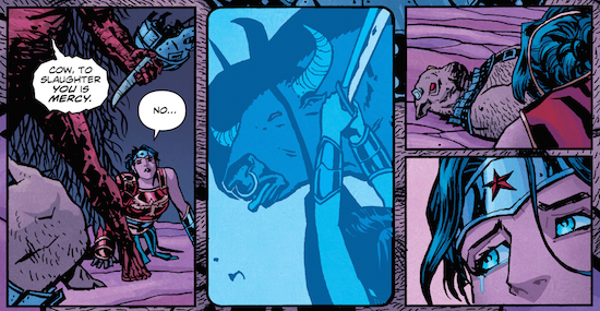 The final showdown was a glorious platform for highlighting what makes Wonder Woman so amazing: her defiance, her determination, and her unerring drive to do what is right. This is where the mythological Gods crumble around her, because she may be one of them, but she is so much more than them. Her lack of selfishness is exemplary and makes her stand out from almost everyone around her. The Gods may have Zeus to idolise and look up to, but in comparison to Diana, he is unworthy of this praise. Her battle with the Minotaur was gruesome and almost a devastating loss, but it is the personification of compassion that inspires her adversary to deliver the same. This extremely important plot point takes us back to a panel in Wonder Woman #0 where she refuses to kill the very same creature. Even the final fate of the First Born revolves around her empathetic nature to enact change around her. It is such a beautiful sight.