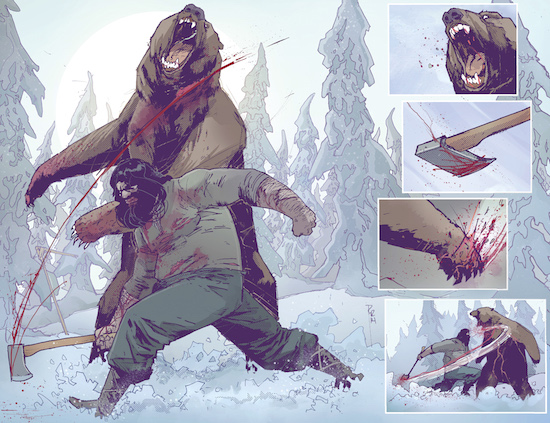The rest of the comic, Grecian dedicates to character exposition, spending its time in the cold light of Siberia, as Grigori chops wood with his father. His father Efin is a monster of a man and is depicted as a giant, who looms over his worrisome child. We don’t really know why he looks so scared until we go back to the family home and see the father physically abuse his wife. It is genuinely uncomfortable to see the violence, which is where Rossmo excels. Once again his depiction of the abusive father is so apt, that we all know how bad he will behave before we see him do it. The scene where he fights a bear is just incredible as Efin stands tall and shows very little fear, reaffirming the notion he is more animal than man. The story plays out in a way you wouldn’t imagine because as realistic as the portrayal of this story may appear, there are mystical elements that allow Rasputin a chance at slow and painful vengeance. The boy is worried but he is not afraid. This is where I get the opportunity to discuss how Riley Rossmo art is so recognisable, because of the way he draws eyes. Almost all emotion pours through them, whether it be the father’s anger, the mother’s fear or the son’s love. They are normally wide and bright and you can see the whole of the whites of them. The shapes are the most expressive aspect and they can tell you all you need to know.