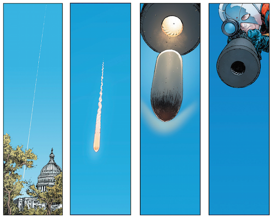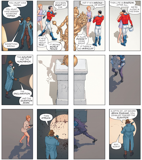These are not even the best pages because the opening silent panels depict the most incredible assassination I have ever seen in comics. As we initially focus on the two symbols of infinity, it pans outwards to reveal the death of the President in a grotesque fashion. As it moves into larger perspectives, we can see that the page is moving backwards and we are seeing exactly how he died and the culprit firing his shot once he readied his position. Each panel holds iconic imagery in its borders, as not a single box is wasted in the story of how the President was killed.