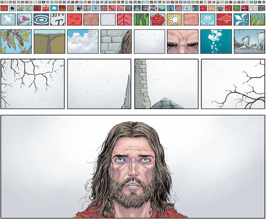 In fact there is a page that features hundreds of panels from centimetres to millimetres in size. It is again a very clever idea that there is a broken man who relives the memories of his life. They progress into smaller and smaller panels and then as they return to normal size, the pictures depict a realisation and the final image is of our President, reformed as a whole. It is here that, as he peruses his memories, he begins to understand everything and his face is one of tearful enlightenment.