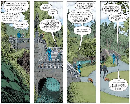 So we start with the death of the President of the United States. This is a man that realised that his father’s comic books were key to the development of Pax Americana, world peace. It is a story about superheroes and villains, and one about the cyclical nature of the world, hence the infinity symbol and the blood stain on dove references. President Harley killed his father by accident, as he was startled whilst holding his gun. Yellow Jacket was a comic artists and a vigilante who had had enough of the corrupt government in the sixties and seventies. His death plunged Harley into a depression that took years to lift, one that was probably sparked by time evading Captain Atom himself, who was not even created then. It was then algorithm 8 was developed and Harley developed a group of superheroes to protect the world. As he stopped terrorists in the White House, he rapidly ascended to the presidency. I think Harley always knew his death was essential to world peace, for the heroes to become villains, at the very beginning. Captain Atom was approached by Harley way back when he was working up the ranks. It was here he gave him a comic book and asked him to do the impossible. He wanted Atom to resurrect the president, to “Redeem the ultimate villain” (there are massive similarities between this comic and the Watchmen). This is where Nora discovered the truth, as she argues with the Peacemaker about killing their leader. I don’t actually think she argued against the assassination but against the idea that the government was trying to stop his plan coming to fruition. She was killed by a superpowered agent of the government, the same people/scientists that may have actually prompted Captain Atom into exile. These scientists were then also murdered by probably the same assassin that killed Nora. The idea that Harley is going to be resurrected may be in jeopardy, as whoever the undercover organisation are, have questioned whether Atom will return at all. If that is the case and Atom could not perform his duties, then the plan would fold and Pax Americana would be no more. What I love most about this book is that the very first scene is pre-ordained by the man who was brutally murdered. President Harley asked the Peacemaker to murder him for the sake of world peace.