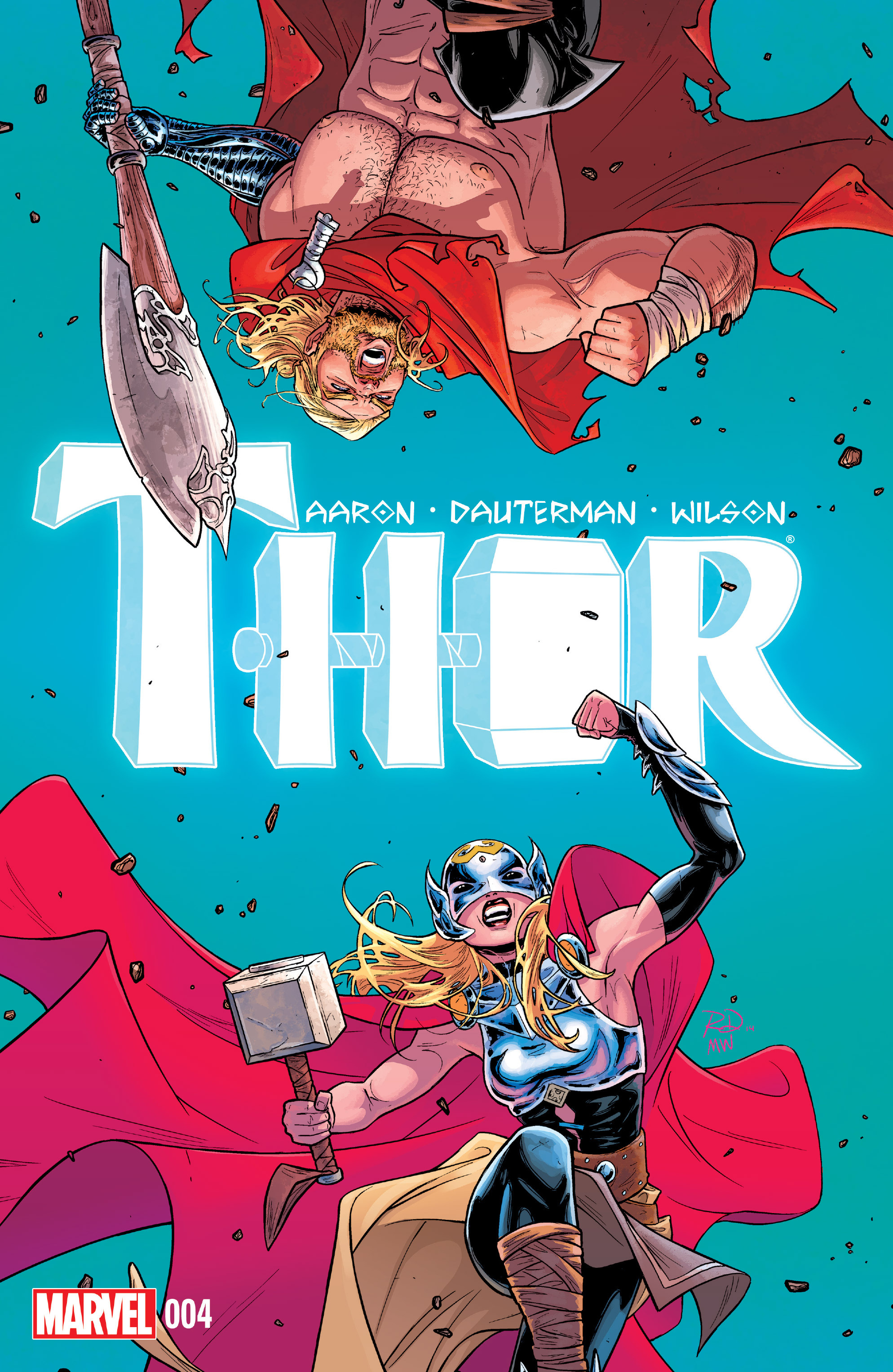 Yes that is right, it is another one of Dauterman’s delightful covers of the week! These pages are not just amazing pieces of art but quite clever aspects of design, such as the Thor under ice cover of issue three. This one is no exception as the page does not just refer to the events of the comic but plays a lovely juxtaposition of both characters called Thor. Dauterman shines as he is able to draw both characters and does so majestically as they need to be shown. Ribic was all about the epic landscapes of the world around them, Dauterman is all about the dynamism and fluidity of the characters. This is exampled by how both Thor’s have such magnificent hair and their cloaks both seem to move of their own accord. The page is not just a comparison of two Thors showed in mirror-esque composition but also the viewer seems to sit below the centre point of the action. The Thors seem to be running towards one another and we see them lean in readying a punch to their opposite number. Their appearances are quite intriguing as the comparison of both outfits are quite telling, because female Thor has a beautiful sheen on her chest plate and mask but male Thor is without and his clothing is ragged and unkempt. The fall of one Thor and rise of another could not be more obvious. This is where Dauterman’s designs truly astound as the new Thor looks so beautiful and regal but old Thor is rugged and hardy. I quite like how tough male Thor looks and his appeal now lies in not in being a prince but in being a pauper. Wilson’s colouring is just magnificent and essential to each character because it makes the page pop out with such vibrancy. It really complements Dauterman and sets a brighter and more lively tone to the whole book. This comic has become so very exciting and auspicious and I am so pleased there is life after Ribic.