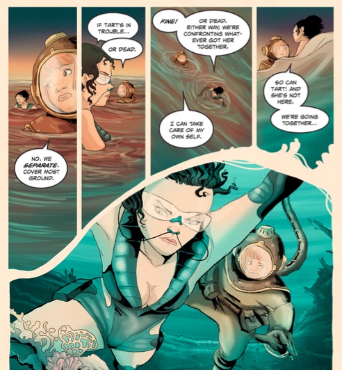 It feels like we have travelled a long road in trying to deliver the Tart comic into the homes of every comic reader out there. Two Kickstarters in and another well past the finish line and it is hard to imagine that Tart is a stranger to anyone. But there is still work to be done as Kevin Joseph and Ludovic Sallé work tirelessly to tell their story of a character, a caring and honest adventurer of fantastical locations. Issue five continues the Submerged arc of Tart and friends being sent to investigate the seemingly haunted waters of the Truk lagoon. We have seen her delve into the fires of hell, deliver a baby in the snow of the French Riveria and hunt spiders in an ice castle. As Tart, Lemon La Morgue and Gloom Tangerine learn to breath underwater, a sinister underwater ghost hunt is also underway.