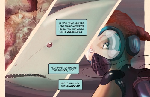 Joseph and Ludo have a specific desire to travel the world and present all types of monsters and creatures. The buccaneering exploits of Tart Acid are echoed in the minds of her creators as not a single comic in the run has repeated locales. Ludo dedicates a significant amount of time drawing Tart in a variety of outfits and environments; you only have to look at the Kickstarter pledges to appreciate this. The opening page sees the three characters in vastly divergent seafaring outfits; even the three ladies all have individual looks. The Truk lagoon is an interesting location to host a ghost hunt because it contains varying amounts of Japanese military wreckage from the Second World War. These make for nice scenic touches such as a sunken tank and wrecked ships in the blurring aquamarine colours of the deep sea. It also allows a place for the action to take place in, and I am sure it is not a spoiler that there are more than just sharks lurking in these waters.