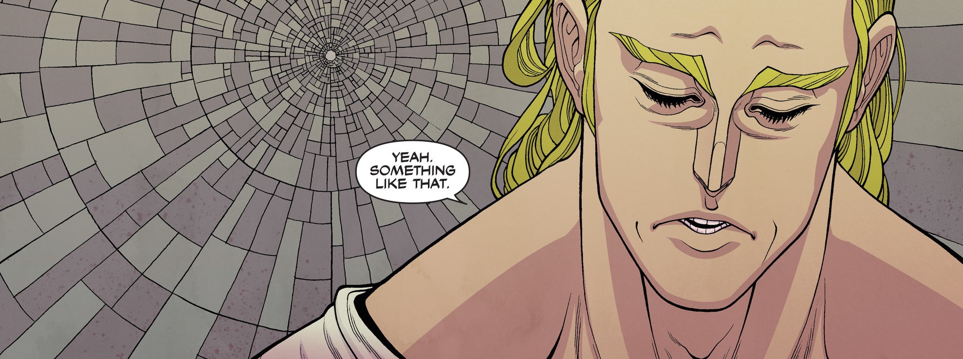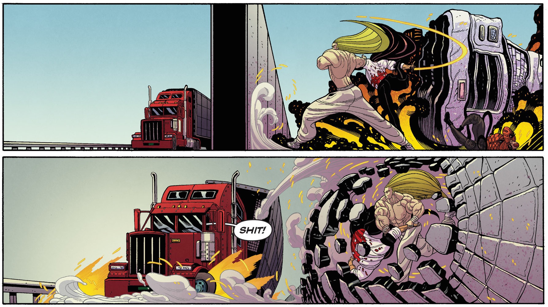Moore’s action sequences move so quickly and vibrantly that they seem to jump off the page in slow motion. It is as if there was a movie director making full use of his special effects department with characters flying through the air, the ground vibrating like fluid and bodies disintegrating in examples of raw energy. Each panel seems to provide a pause in motion to allow the reader to see posture and the readying of the next movement. We are catching glimpses during a playback of stunning motion, similar to watching classic kung fu manga. There are breathtaking uses of panelling, such as the zooming into Strode’s feet as he leaps onto a car bonnet or the hurling of a villain through a wall as a lorry slowly passes the other side. It is just non-stop and surprisingly does not become boring because the scene moves from bar to rooftop to cars and lorries. Felipe Sobreiro is also responsible for the effervescence of the motion because the punches fizz with sparks, the cars blaze a trail of fire with the backgrounds changing in colour to reflect the mood of the fight.