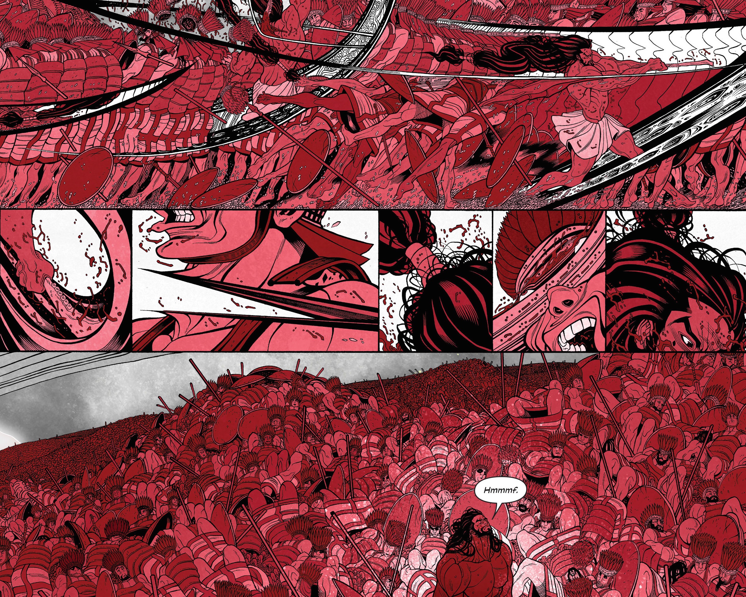 Aside from the astounding ferocity of action, I found proportionally less depth to the characters in the last volume. The love of Petra and Luther was the one bond that gave a reason for the savagery but this opening comic portrays a different kind of story. It is no longer a test of strength because we have had two whole story arcs proving that is certainly Strode, but perhaps more of a test of love. It is not as if Strode is looking for a confrontation, but there are moments where he is called into the fray because no one else will. Despite his amazing ability to mutilate and destroy, he is remarkably calm after his actions. This latest arc is going to change that and there are many moments in this issue where Luther looks quite resigned and solemn, fitting with a dialogue of regret and upset. As he stares through the hole in his enemy’s head, he looks desperately sad, echoing the opening pages of Samson’s parable. Those feelings all wash away with the sight of his beloved, and a smile re-emerges making all well again. But for how long will love justify the barbarity and how long can Luther keep fighting? Is this desire for justice and negation of the enemy an honourable one or maybe he has become dependent on Petra being at his side? But what happens if that stops being the case? Like Samson, if you remove the strength of a man, what is left to fight for? There are so many possibilities open to the story that I am very excited to see how it will progress, and how it’ll link together with the tragedy that was Samson and Delilah.