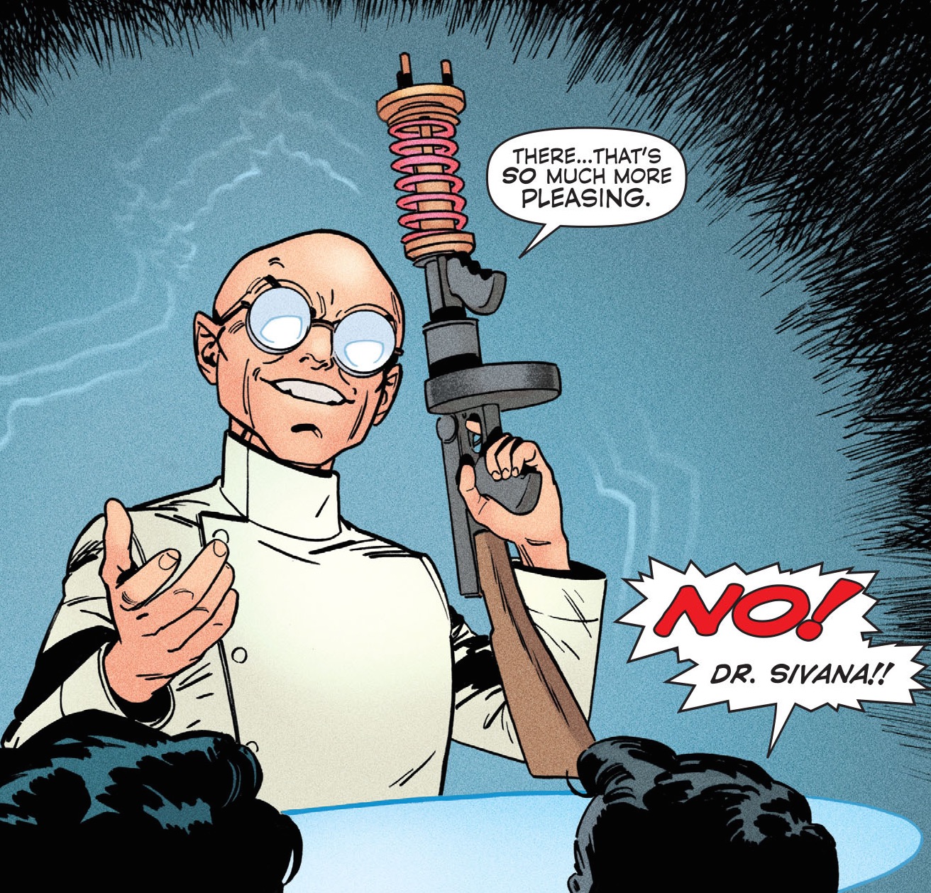 He starts with a quizzical glance to the sky, almost challenging whoever is up there which transitions towards hope in the next box, with a close up of his eyes closed. It then returns to show his hands open with a desperate frown, asking the question, why? It is wonderful little sequence and tells you so much of the story even if you did not know what was happening in Convergence. The issue continues within the realms of the adventurous youth detective trope and we meet some brilliantly cliché bad guys. The cave man inventor and a giant dumb robot, all controlled by the crazed scientist Dr Sivana. He has such a great look with giant frame glasses hiding his eyes and the neck buttoned lab coat with a ridiculous gun to complete the look. The expressions the kids produce are just priceless with furrowed brows and evil glares.