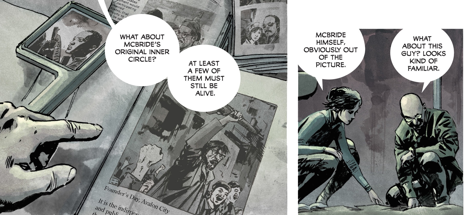 Gabriel Hardman and Corinna Bechko deliberately keep the writing coy because they know that, in this final issue, all will be revealed. The question posed from the very beginning is how does Arthur McBride go from being a wanted man to leading a nation with an iron fist. It is a story so unfamiliar in any form of media that it begs belief and Hardman holds onto that premise for as long as possible. The writing and plot is very intelligent as he keeps it firmly on the ground level with Maia struggling to find general safety, registration papers, and employment. In a city slowly organising its rebel forces, we follow Maia into a beekeeping apprenticeship. There is a deliberate disconnect to keep the story at a personal level and not veer straight into a political forum. But that is where the strength of the book lies. Within all infamous organisations there was once a foundation stone, often a single person with an idea. That is even more apparent in the future sub plot that is aiming to uncover the insidious machinations of a government in order to discredit it. Their focus is not on a current ruse or deception but one that happened at the very beginning of the rebellion. The main story is certainly going to escalate into social organisation and politicking but it needs a beginning. And that beginning is Arthur McBride being recorded killing a guard on a beach, before the Che Guevara-esque iconography began: