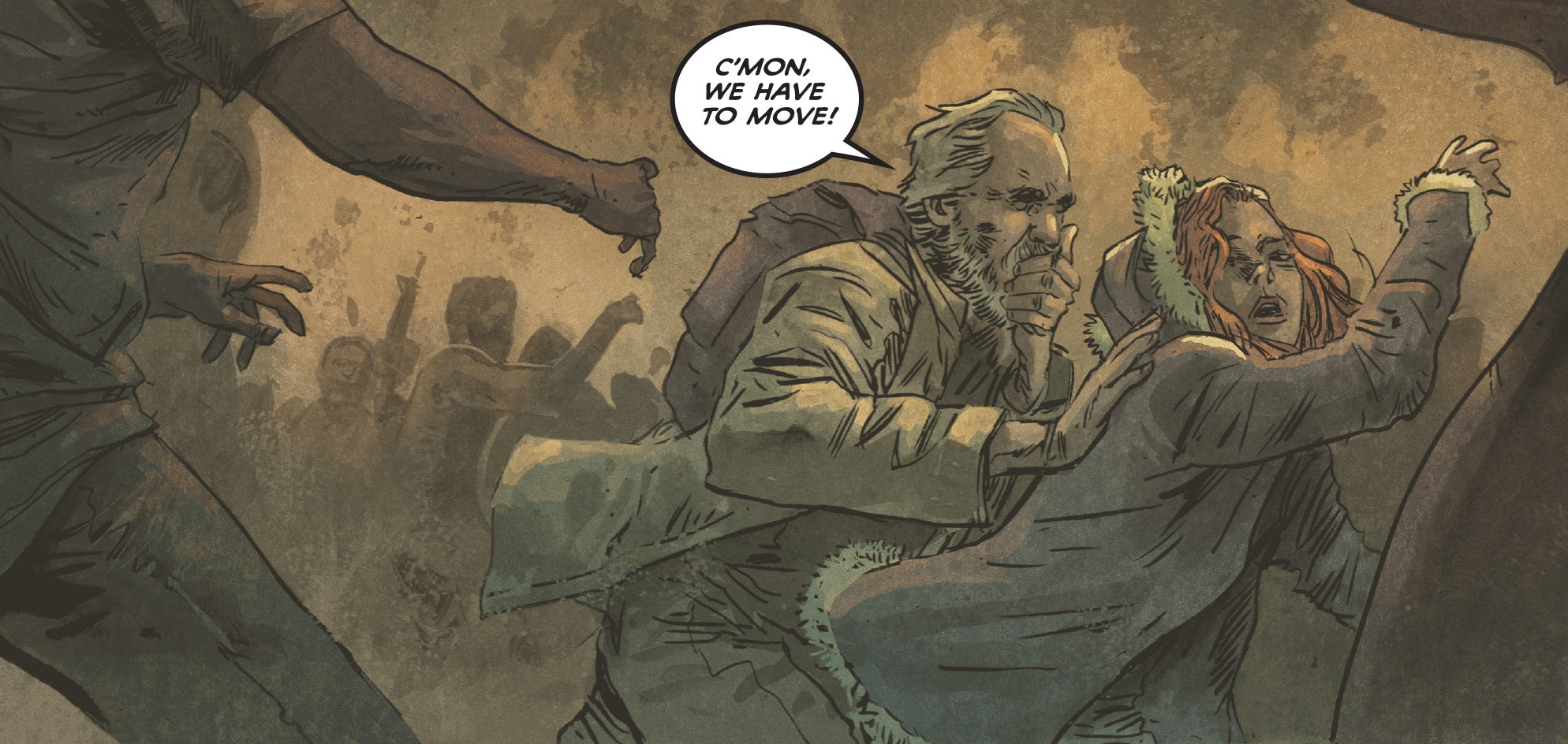 Hardman is also drawing the book together with Jordan Boyd on colours, and they try to keep the two time stories apart. But in order to capture the environments at hand they have to keep it dark, devoid of light and bleak, after all both the rebel agenda and detective sleuthing are found beneath the centre stage. The McBride regime in the future is coloured bluer and greyer, which is in keeping with a paper trail chase. Otherwise the landscapes of the past are quite varied because the rural aspects of Maia’s day job are quite bright but the cityscape portrayal is fantastically dimly lit. The dark corners and streetlights allow the subterfuge and rebellion room to manoeuvre. The shading is particularly impressive as Hardman manages to capture dismay and anger whilst half of the character face is in darkness. This is particularly poignant when an important reveal occurs within the frenzy of the crowd. The following pages are wonderful in their ability to depict the carnage of smoke filled streets as Maia and her friends run through trying to make their way to safety.