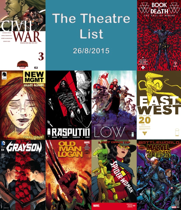 The weeks seem to blur into one these past few months. DC continue with their mix of new and old themed books of which I pick up very few, Marvel persisting with either patch work titles or the final days of solo stories and Image together with others producing great work. Both Cyborg and Sinestro were perfectly competent books but had nothing new or inventive from a story or art perspective to warrant recommendation. Superman was similar but the tease of a Lois relationship beginning felt a little off. The Flash continued down its dismal trajectory with a new villain that has no reason for existence, even the Wally West sub-plot has become uninteresting. As always there are decent Marvel books and as much as I resent the story of Old Man Logan, I am infatuated with the art and so it makes my list. Ant-Man failed to entertain sufficiently enough despite it being very original end of world scenario. Perhaps it was a case of the concept being too non-conformist for it to be funny. I also enjoyed Captain Marvel but there was not enough story for it to be recommended upon art and characterisation alone. It is worth a quick mention that Hank Johnson – Agent of Hydra was very entertaining. Both Hacktivist and Spread were titles that deviated from the main characters and gave some exposition to the supporting cast, and they were solid books but just failed to pique enough passion for recommendation. I really want to enjoy Fight Club 2 but it is just too clever for it’s own good and I wonder if the comic medium is doing it justice. I say that but that would be the fault of the creator if it didn’t but it is worth noting that the flashback sequences rely on familiarity. If the scene it refers to occurred in the movie than a comic representation may not conjure those memories of old. However despite my misgivings, there were still enough enjoyable books to read.