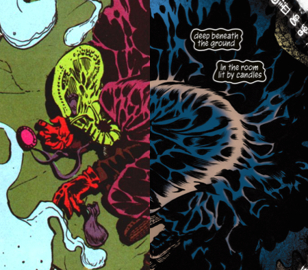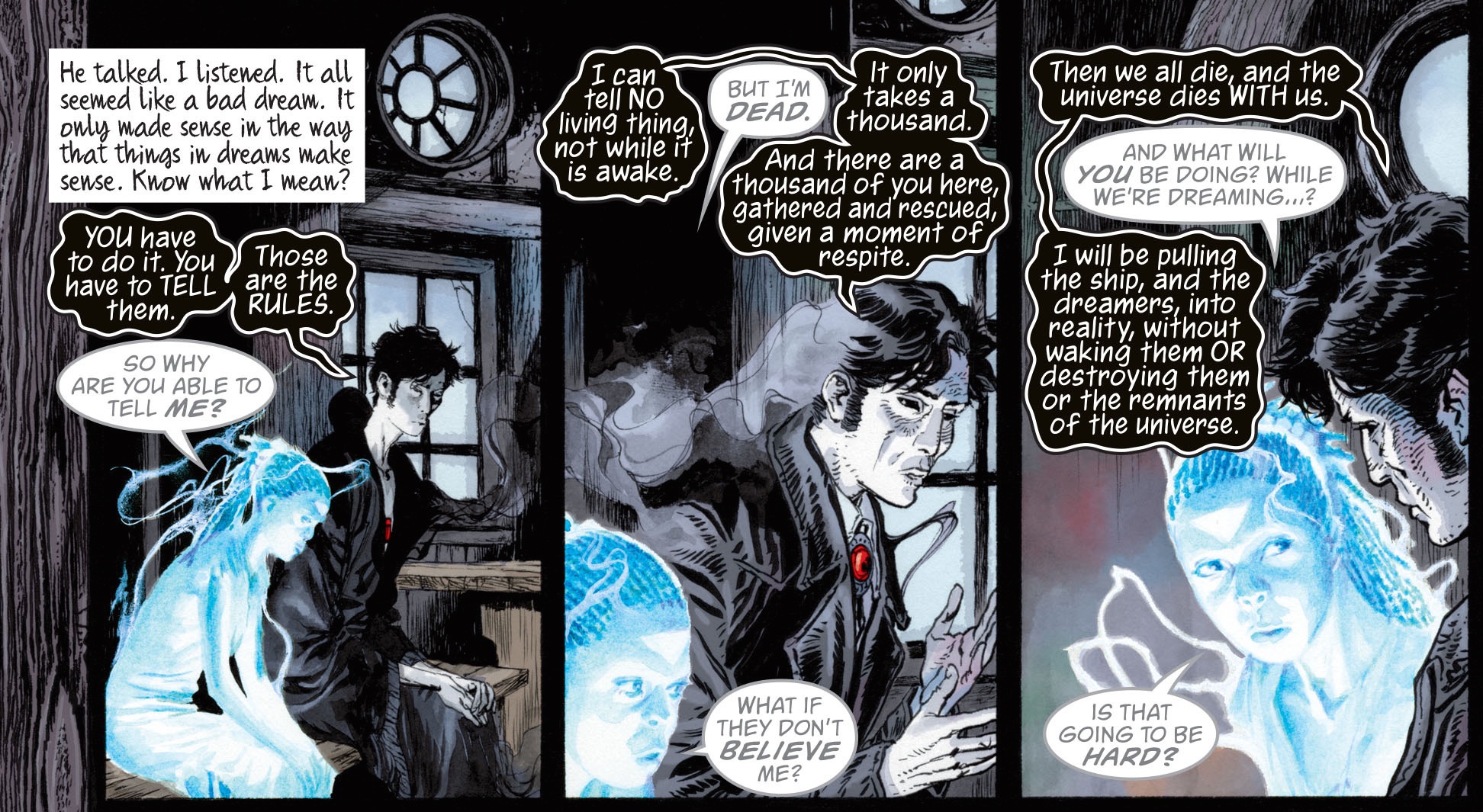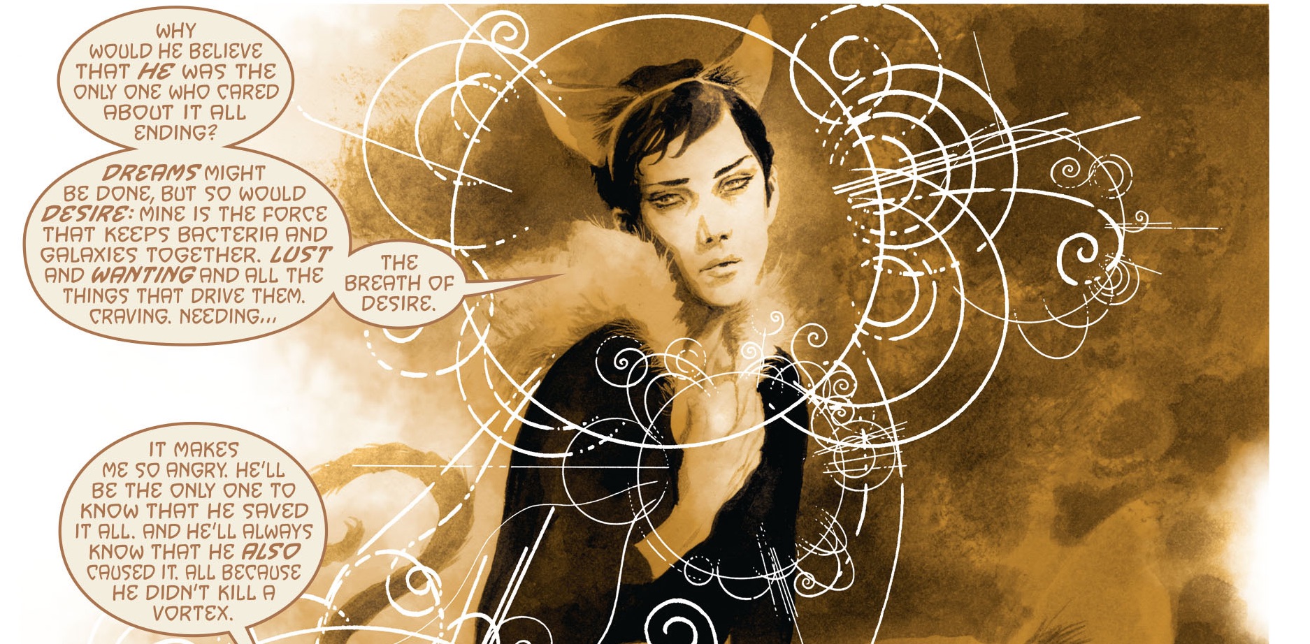 I do enjoy the fact that all of the brothers and sisters have names beginning with D: Dream, Desire, Destiny, Delight, Delirium, Despair and Destruction. It is Dream’s relationship with Desire that is most intriguing, especially as his mother states that they are so similar. There is a sense of caring from Desire all of the way through and even in issue one she relays her concerns for Dream to their brother Destiny. As much as we begin to understand Dream through Desire, it is quite obvious that he desperately dislikes her and refuses assistance. There are comments throughout about how he must take responsibility and do this alone, even being mistrusting of the Dream cat. In hindsight that was not so stubborn as once thought because she turns out to be none other than Desire herself. Whilst Dream is caught in the Black Hole, it is Desire who creates a vessel that exists out of the real world and has numerous species saved from extinction that serve as the catalysts to Dream’s deliverance. Their relationship remains very strained that even at the very end, Desire’s final words are, “You know what kills me? Only you’ll remember that you and I saved the universe. I sure as hell wont.” Her love for her brother does not extend that far and with good reason too as Dream refuses to forgive her subterfuge even at the end.