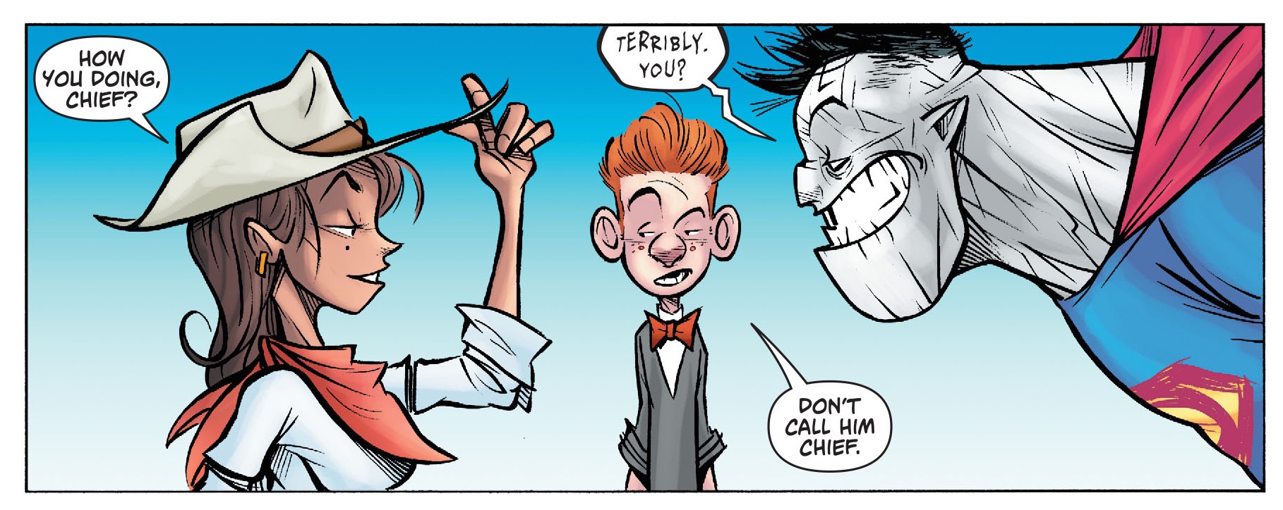 Though the use of letterbox panelling is limited in this book, there are moments where the stillness of characters effects the desired movement. If they are timed correctly with the correct expressions then they become quite amusing, such as Bizarro falling into another dimension. Often the rapport between Jimmy and Bizarro is shown through facial expression between one another, whether it is a stupid grin through teeth or eyebrows raised to the skies.