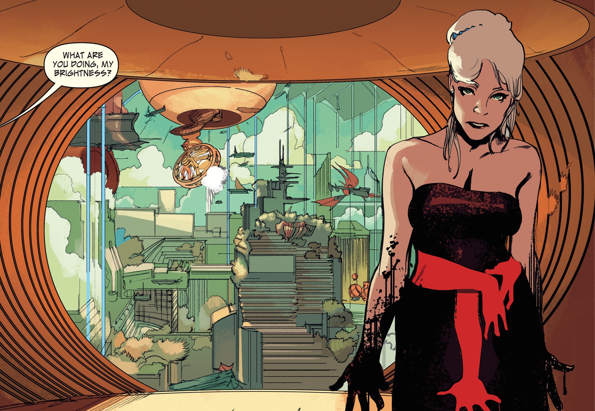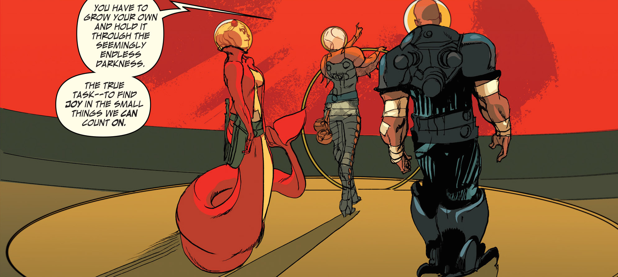 Mrs Caine is a woman that has seen loss and pain almost everywhere she has travelled. In the very first issue her husband was murdered and her twin girls abducted. She raised Marik to become an immoral, incompetent and despondent young man in a world prophesised for destruction. There is almost no positivity in this book and when the evidence that there is life on the surface of the planet comes to light, Stel and Marik embark on their voyage of hope. The journey took them into a pit of depravity known as the city of Poluma where they find the captive sister Tajo. The redemption of Marik was impressively handled as he gives his life to rescue his sibling, but the mother’s guilt only deepens as a petulant Tajo destroys Poluma in a fit of rage and vengeance. She ventures off to find her twin abandoning her mother who in her grief finds solace in trying to reach the surface. On her journey she is accompanied by two of Marik’s kinsman, a crew of sorts that temporarily became her family. All this in just nine issues of comic books…