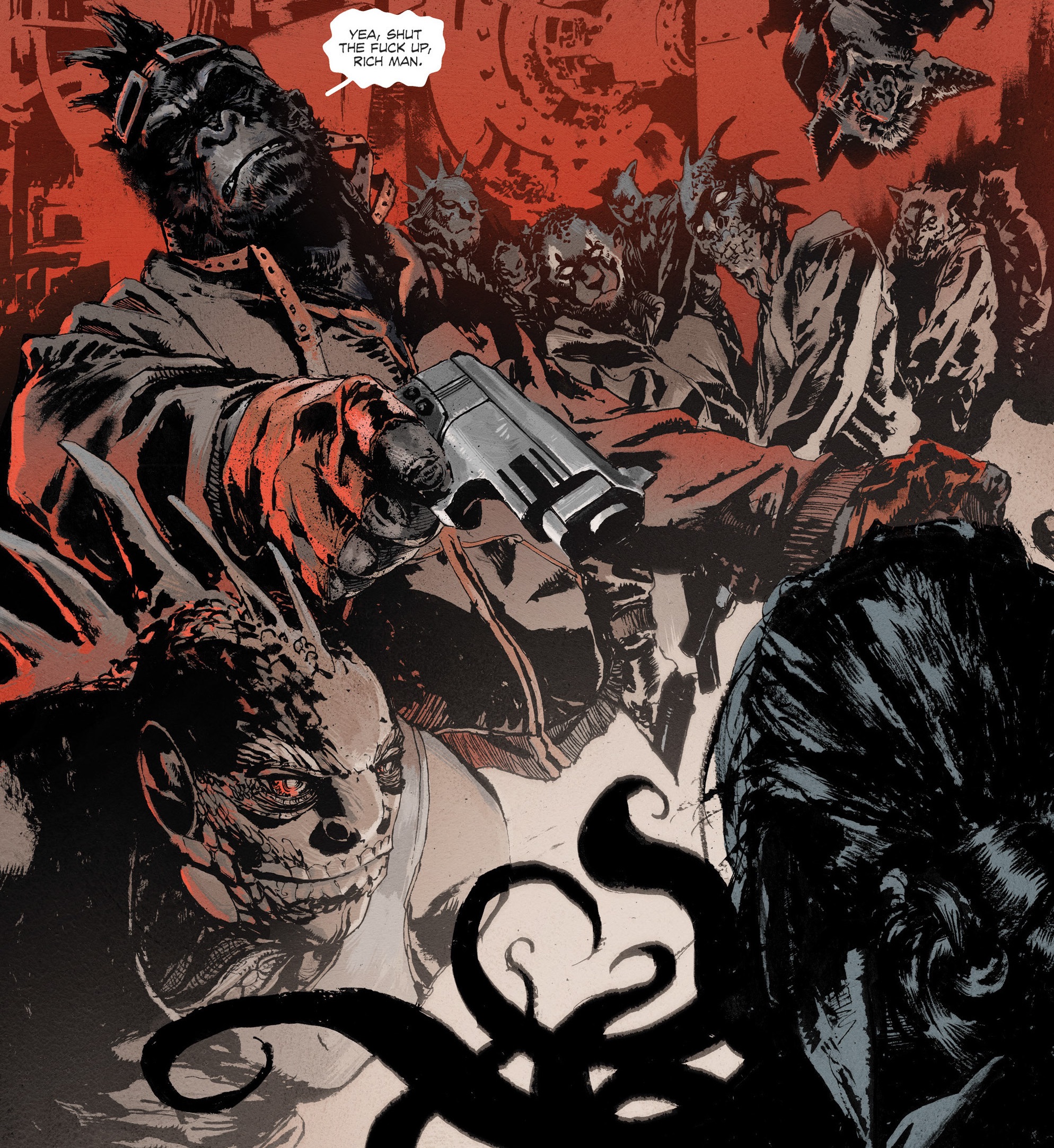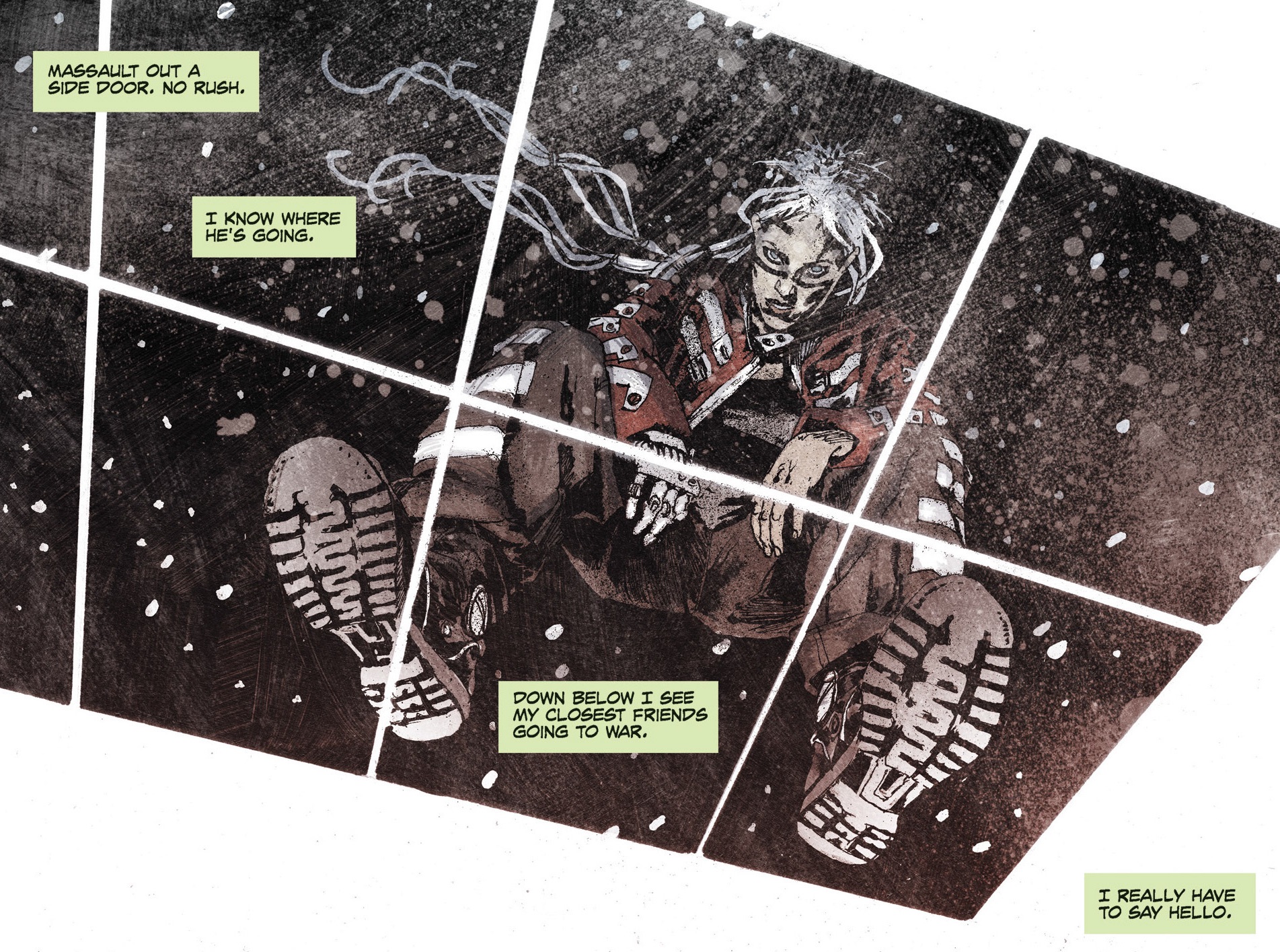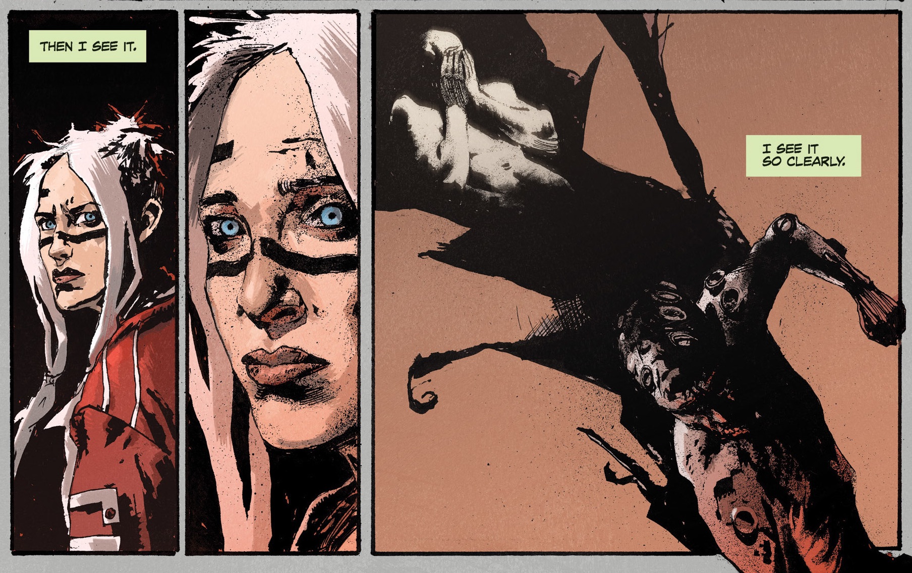 This book is dark, like really dark. The first aspect that leaps out at you is the suffocation of light even during the daylight scenes. Whether this is Jason Shawn Alexander’s preferred style or the direction he wishes to take the book, remains to be seen but it is effective nonetheless. The characters are drawn with great detail but not from an ink and line perspective as such, but from the textured colouring of shades. Our central protagonist Corinne carries the burden of her past heftily on her expression, which is impressive considering the first thing you would notice about is the loss of her arm. Her depression emanates through the page and her ever so slightly furrowed forehead taint any positive emotion she might see herself worthy to have. Her interactions with her friends and enemies are cries of solitude and screams of salvation. The final issue of the story arc takes you into her darkness and tries to bring in some light.
